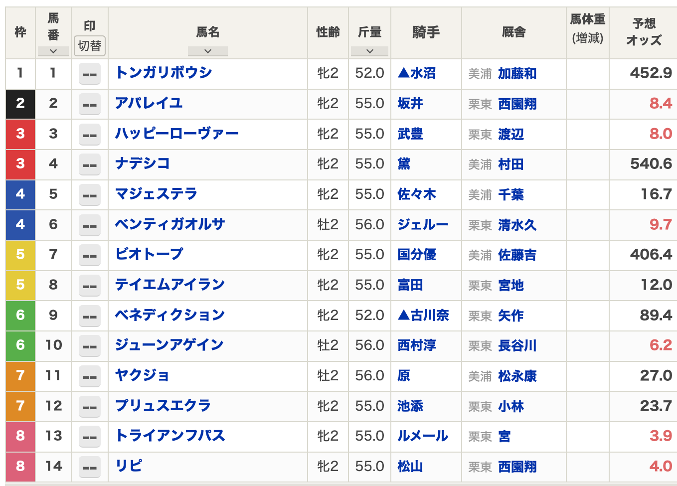 2戦目ですので、外枠がいいのか? 内枠がいいのか?