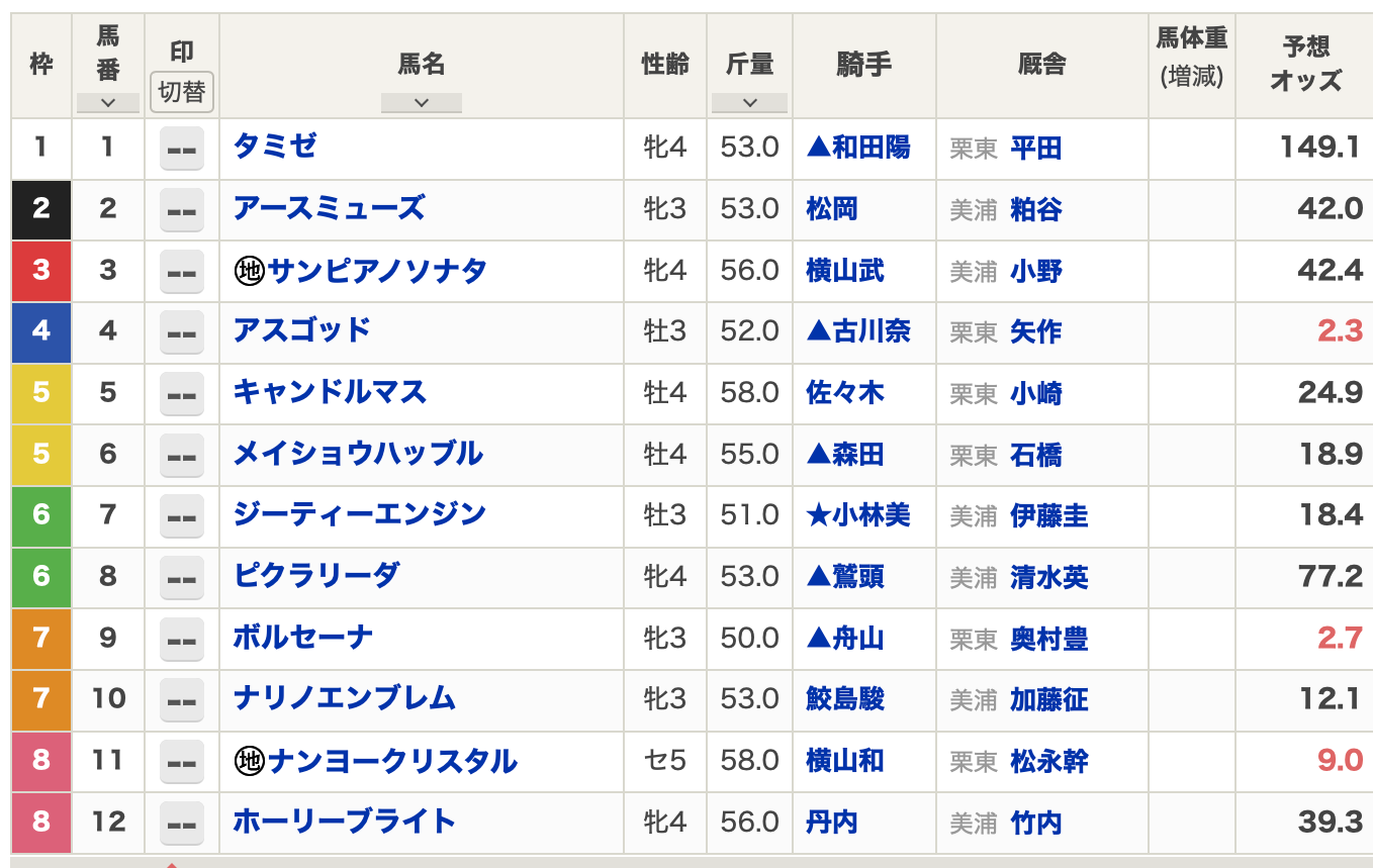 今回はまた1000ダートです。枠順は4枠4番 内枠が多いですなぁ。